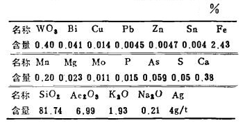 1 矿石性质该矿区是以原生云英岩石英细脉带型黑钨为主的岩浆期后气化-高温热液矿床。矿石多为浸染状构造, 特别是黑钨矿呈中细粒不均匀浸染体嵌布在块状石英内和白灰色及深灰色的两种矿脉中, 以致各种围岩不同程度矿化。该矿矿床的有用矿物主要是黑钨矿, 其次是白钨矿、辉铋矿、含银辉铅铋矿、泡铋矿、辉钼矿、磷钇矿、黄铁矿、黄铜矿、毒砂及锡石等。脉石矿物主要是石英与白云母, 其次有萤石、黄玉、磷灰石等。矿石多元素分析见表 1, 钨物相分析结果见表 2。黑钨矿粒度偏细, 粒径在1.5~0.01mm之间, 而大部分为1~0.lmm粒径。黑钨矿单体解离度测定, -1+0.5mm粒级单体率为63.97%, -0.5+0.3mm粒级单体率为76.32%, -0.2+0.1mm粒级黑钨矿基本已单体解离, 其解离率达91.68%。矿石中铋含量0.041%、可供综合回收。磷呈磷钇矿、磷灰石矿物相产出, 又以磷钇矿相为主。毒砂是该矿石含砷的主要矿物。锡以锡石相产出。磷、砷、锡都是影响黑钨精矿质量的杂质元索, 故该矿石属难选钨矿石。