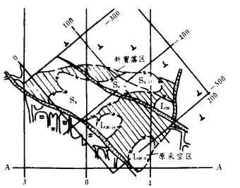 c. 空区的冒落横向(平面)扩展较快, 其一般规律是先片帮后冒顶, 空区顶板冒落成自然平衡拱, 此后空区可以相对稳定一段时间, 然后再次打破这种暂时的平衡, 重新出现冒落, 而顶板总是以拱形向上发展, 平面上则使不规则的空区形迹逐渐冒落成近似椭圆形, 空区冒落形迹的最大轴向受煌斑岩脉控制。