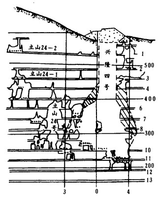 d. 兴隆4号和兴隆4-19号两个空区在九中段的夹墙倒塌后, 引起兴隆4号和兴隆4-13号两个空区分别向上冒落和扩展, 从时间上看, 在1984年以前, 上述两空区出现的冒落是各自独立的, 这一点从联合空区在七中段的平面图上可以得到佐证; 在1984年1 ~ 6月间的冒落前兆期, 其主要特征是兴隆4号和兴隆4-13号两空区因兴隆4号与兴隆4-19号两空区在九中段上部的夹墙出现倒塌, 引起两个空区各自独立的向上冒落, 在这段时间里, 兴隆4号空区冒到七中段, 而兴隆4-13号空区冒到六中段, 但两空区在七中段厚度达20余m的夹墙仍保持完好, 此时两空区的次生应力大多集中在此夹墙上; 1984年6月以后, 兴隆4号联合空区急剧冒落的主要特点是两空区在七中段厚度为20 m的夹墙出现倒塌, 使两空区在七中段相互连通, 此时空区的暴露面积达7500m2, 随着该夹墙的倒塌, 空区暴露面积增大, 急剧性冒落则开始, 进而导致该联合空区冒透地表。由此可见, 1984年6月3日兴隆4号和兴隆4-13号两个空区在七中段夹墙的倒塌可视为该联合空区冒落的前兆期和急剧性冒落的临界点。