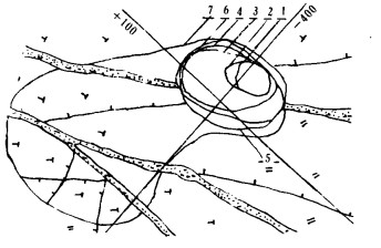 | 1-1969年8月开采验收图; 2-1974年冒落扩展情况; 3-1976年2月充填设计前; 4 -1980年3月空区调查情况; 5-1981年6月空区调查情况; 6-1982年3月冒落情况; 7-1984年8月大冒落后的空区。 图 3 兴隆4号联合空区七中段冒落情况 |