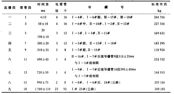 该次炸药量为1865t的边坡工程控制大爆破, 在设计中采用三项关键技术, 在施爆中又有一些独到决策, 其出发点在于达到设计中的四项工程要求.该次大爆破各爆段参量如表 1。