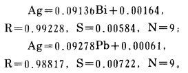 在显著水平α= 0.001时, 临界值Rα= 0.8982, 可见Ag—Bi和Ag—Pb皆具明显的正线性相关性。如图 1、图 2。
