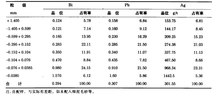 表 1是综合毛砂筛析的铋、铅、银分析。
