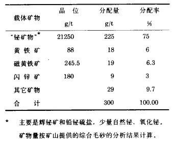 根据矿物量和矿物的含银分析计算, 综合毛砂中银的分配列于表 2。75 %的银分配在以硫化铋为主的铋矿物中。"其他矿物"一项的分配率占9.7%, 其中包括了分配于方铅矿的银。