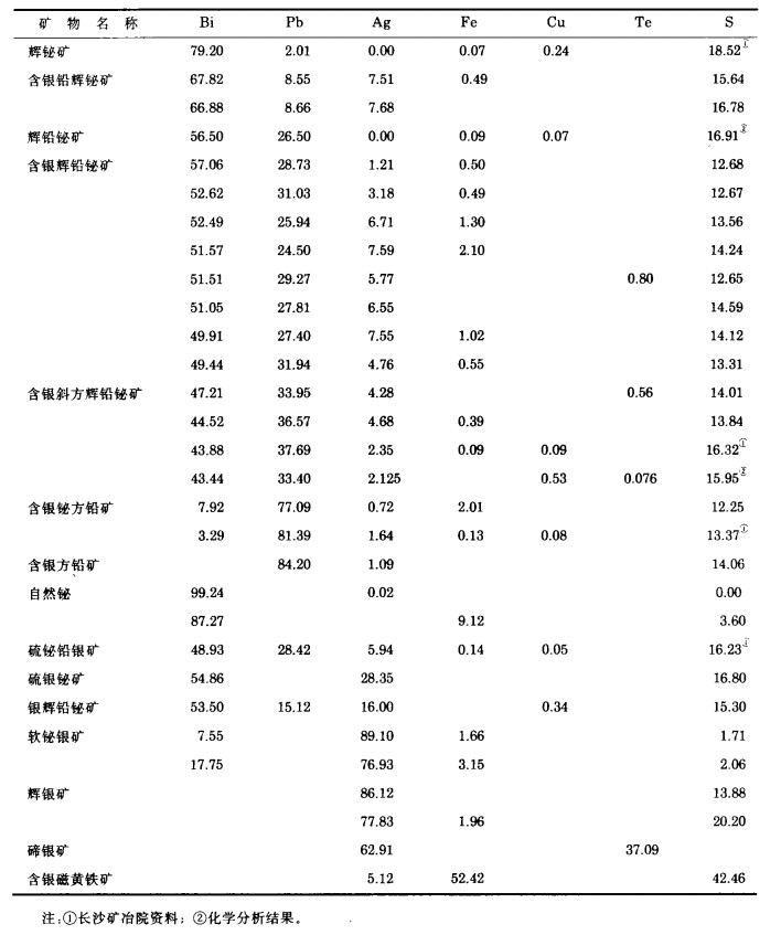总之.银主要分布于Bi2S3-PbS系列矿物中。一是形成各种含银硫盐矿物、含银铅辉铋矿和含锒方铅矿; 二是呈含铅铋的银矿物和大数不多的辉银矿、碲银矿等分布于系列矿物中。所以在选矿实践中银主要富集于铋精矿中绝非隅然。同时也证明了银与铋、与铅的相关性。