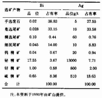 3 铋和银的选矿回收现状表 4是铋和银在选矿产物中的分布, 铋和银主要损失于手选废石、重选尾矿和细泥尾矿, 三者合计损失Bi85.98舛.损失Ag 69.96%。此外, 混杂于硫精旷的Bi占8.36%,Ag占18.63%。作为商品铋精矿的Bi回收率仅3.67%,含于铋精矿能在冶炼中回收的Ag仅7.71%。所以说铋和银的选矿回收现状很不理想。
