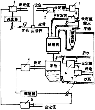 | 1.矿水比; 2.矿灰比; 3.给矿算法; 4.液位算法; 5.功率算法; 6.流量算法; 7.浓度算法; 8.流量算法1。 图 1 前3万t磨矿控制流程图 |
