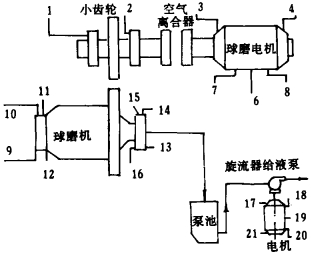 (2) 磨机部分。主要有:①ϕ5.5m×8.5m溢流型球磨机主机1台(包括筒体、端盖、大小齿轮、中空轴等); ②Airflex5.1 VC1600磨机传动离合器(空气离合器)1台, 把小齿轮轴与磨机传动电机相联, 空气压力为70370kg/m2; ③小齿轮润滑系统1套; ④主轴润滑系统1套, 为主轴提供连续地静压与动压润滑; ⑤主轴液压系统(筒体顶起及止推)1套, 主要用于球磨机顶起和径向止推作用; ⑥大齿轮喷雾系统1套; ⑦衬板机械手, 4个系列共用1台, 最大提升为907.2kg, 用于衬板检修升降; ⑧微拖装置, 4个系列共用1台, 55.2kW球磨机低速旋转装置, 主要用于维修时盘车和长时间静止再启动时松散物料用, 转速为0.1转/分; ⑨驱动电机(同步电机)1台, TS型功率为4042.5kW。