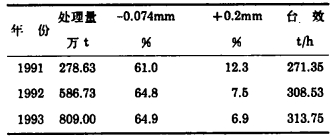 4 磨矿效果磨矿细度是磨矿作业的质量指标, 是评价磨矿效果的主要依据, 附表是大山选矿厂1991年至1993年前3万t球磨机历年运行指标。