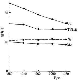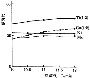 图 3直观地告诉我们, 加大冷却气流量, 铜、钛二者的信背比呈上升态势, 钼元素的信背比稍有改善, 而镍元素的信背比几乎没有什么变化。从试验效果来看, 冷却气为12L/min时, 对提高待测元素的信背比更为有利。