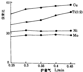 由图 4知, 加大护套气流量, 铜、钛二者的信背比有明显改善, 而钼、镍二者的信背比变化不大。权衡多种因素之后, 试验把护套气控制在0.3L/min。