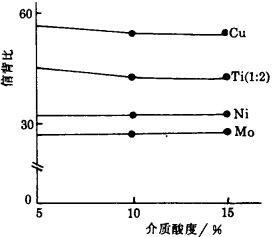(5) 介质酸度选择:介质酸度对元素信背比的影响, 是个不容忽视的问题。这是因为介质酸度的变化, 可能影响进样量不一致, 从而导致分析元素信号强度的波动。从考察结果(见图 6)来看, 介质酸度变化, 对钼、镍二者的信背比影响很小, 但对铜、钛二者的信背比影响较大。因此, 硝酸介质酸度应控制在5%(V/V)。