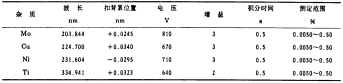 在主体元素谱线复杂的情况下, 一般采用小狭缝, 这样可提高仪器检测系统的分辨能力。但此时光强度损失较大, 强度值也有些波动。本试验在选用仪器狭缝时, 主要考虑了两个方面的原因。一是在仪器检测窗口范围内, 待测元素分析线两侧均没有发现其他复杂谱线, 对仪器检测系统寻找分析线峰值位置极为有利。二是Mo、Ni二者的检测灵敏度不高, 需要设法加大积分强度。因此, 试验选用了后一组狭缝。试验效果表明, 入射狭缝30μ, 出射狭缝35μ, 对提高分析方法的精密度和准确度是至关重要的。
