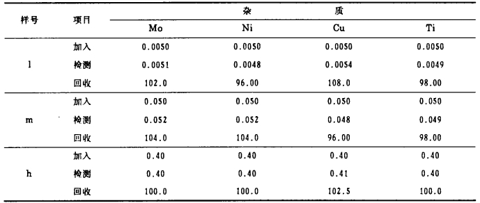(1) 本试验制订的分析方法, 适用于金属镝中铜、钼、镍和钛量的测定, 也适用于氧化镝中氧化铜和氧化亚镍的检测。