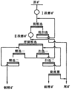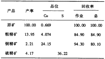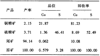 1996年一季度平均生产指标(试验前)为:原矿含Cu 0.636%, 铜精矿含Cu 20.39%、铜回收率75.10%。未回收硫。
