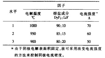 不管是电效或镝含量, 都是在电解温度下极差值最大, 即影响电效和合金中镝品位的主要因素均是电解温度, 电流强度和熔盐成分的影响次之。较佳的工艺条件为电解温度900-950℃, 阴极电流密度为9.6A/Cm2, 以电流强度表示则为60A, 熔盐成分DyF3: LiF为90:10。