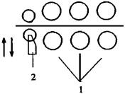 1.出口校平辊(3组); 2.调节辊轮(3个) 图 5 出口校平辊示意图 |