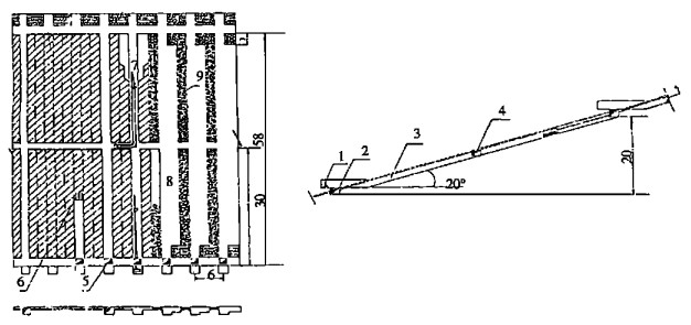 充填前, 先将分条内矿碴清理干净, 以免损失高品位粉矿和影响充填质量; 再沿上山充填侧自下而上分段架设木立柱和木模板(立柱直径Ø12 ~ 14cm, 间距1.5~ 2m, 木板厚3cm), 并要求模板之间及其两端接头处无缝隙, 以免漏浆。