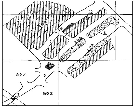 | 1.75m中段平巷; 2.集矿漏斗; 3.探矿上山; 4.块石砂浆柱; 5.沿脉分段平巷; 6.分条采准上山; 7.90m水平沿脉; 8.全粒级废石胶结充填条柱; 9.回风联络道; 10.崩矿炮眼 图 3 试验采场采切工程布置 |