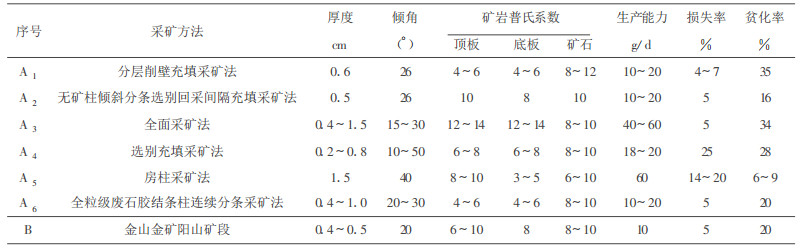 2 采矿方法模糊优选 2.1 采矿方法初选根据阳山矿段矿体开采条件, 参考国内外类似矿山的采矿方法, 提出6种备选采矿方法, 其开采技术条件和主要经济指标见表 1。