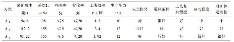 根据最大隶属度原则, A6方案即全粒级废石胶结条柱连续分条采矿法最优。