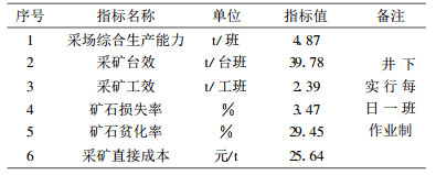 3.6 主要技术经济指标试验共完成了5个分条的回采和充填工作, 采出矿石760t, 胶结充填246m3。主要技术经济指标见表 4。