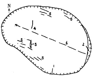 1.滑坡边界; 2.主裂缝; 3.鼓张裂缝; 4.剪裂缝; 5.扇状裂缝; 6.主滑方向 图 1 滑坡体平面图 |