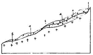 上述情况表明, 滑坡体表土层以上松散堆积物具有典型散体结构性质, 它与表土接触成不偶合状态, 只有重压贴靠接触, 加上介质上的强度差异, 其间的界面十分明显。该散体抗剪强度极低, τ < 0.1MPa, 而且在没有侧向约束力的限制时, 更容易在外因诱发下产生重力性位移。