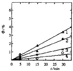 3 实验结果与讨论 3.1 载体种类对液膜破损的影响为考察各种载体对液膜破损率(Ф)的影响, 本实验选用了P204, P507, C272, LIX984做载体, 表面活性剂采用LMS-2, 实验结果见图 3。由图 3可见, LMS-2与C272组成液膜体系最稳定, 稳定顺序为P507 <P204 <LIX984 <C272。