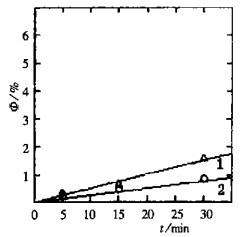 1 LMS-2(2%)+3%LIX984 +煤油; 2 LMS-2(5%)十3%LIX984十煤油 图 6 表面活性剂浓度对液膜破损的影响 |