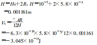 其中e为基本电子电量, e= 1.8× 10-19C, k为Bolthsman常数1.38 × 10-23, 绝对温度T= 298K, 某种离子的mol体积浓度, 在实验的条件下, ci= 4.1mol/m3, 离子的化合价zi=-1, n0为阿佛家德罗常数6.02× 1023, 在双电层厚度δ处的电位, 对于LMS-2表面活性剂[6]φδ=80mV。乳状液膜的介电常数ε值为ε=6, κ为Debye-Hükel参数, 1/κ为双电层的厚度(δ), γ0为Stern层系数, 根据以上已知条件得出, κ=1814, γ0=0.2729。所以VR=5.365×10-5J双电层的厚度为: