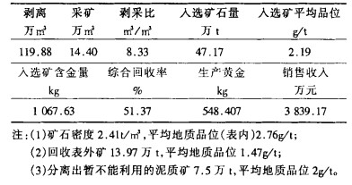 5 历年来主要技术经济指标截至2002年6月底,吴家金矿累计生产黄金548.407kg,销售收入3 839.17万元,取得较好的经济效益与社会效益(详见表 2)。