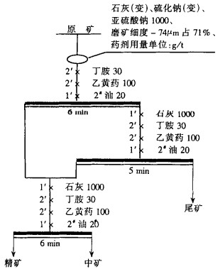 1.3 浮选试验 1.3.1 现有工艺流程试验试验流程和固定条件仿照以丁胺为主要药剂进行石灰和硫化钠试验的浮选流程, 如图 1所示, 试验结果见表 3。