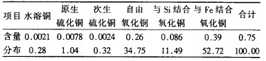 3 结语(1) 城门山铜矿含有大量粘土型和结合性氧化矿。从铜的物相分析可知, 7#矿体38m、26m台阶的氧化率高达98.96%和91.13%, 且大部分属于难选的结合氧化铜。但由于该部分矿石含铜品位较高(试验矿样分别达到了0.75%、3.85%、1.29%), 如果将其作为废石丢弃, 将造成铜资源的浪费。