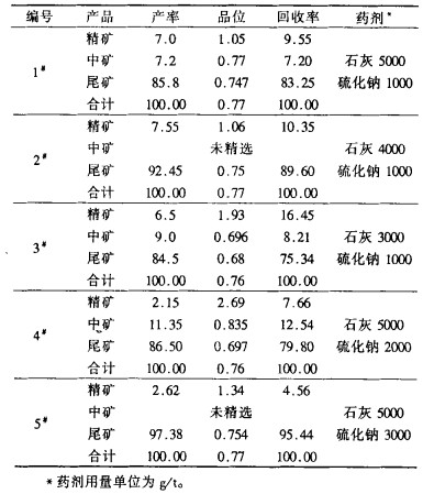 脱泥浮选虽然铜回收效果不明显(精矿铜回收率不到15%), 但脱泥后, 精矿铜品位却有较大提高(最高达到22.41%), 说明硫化浮选有一定效果, 因此着重进行了硫化工艺浮选。
