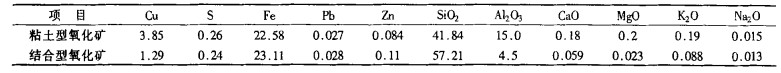 城门山铜矿采用露天开采, 设计初期开采规模为1 200t/d。生产前期主要开采7#矿体, 2000年7月城门山铜矿投料试车, 处理的就是该矿体38m台阶的矿石, 但由于该矿体-2m以上大部分为结合型和粘土型氧化铜矿石, 矿石泥化严重, 氧化率高达90%以上, 采用常规选矿方法根本无法正常组织生产, 不得已只好停车待产。为了探索该部分矿石是否具有开采价值, 2000年分别进行了选矿试验和浸出—萃取—电积试验。