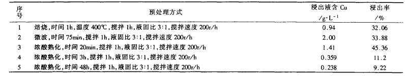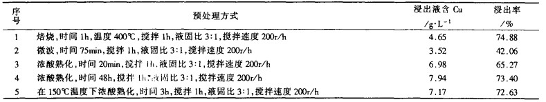 2.3 浸出试验 2.3.1 搅拌浸出试验从试验结果分析(见表 6、表 7), 粘土型氧化矿焙烧后, 铜浸出率最高(74.88%), 但一般条件下浓酸熟化时间长一点, 浸出率也可以达到73.40%, 因此, 采用一般浓酸熟化工艺条件比较可行。