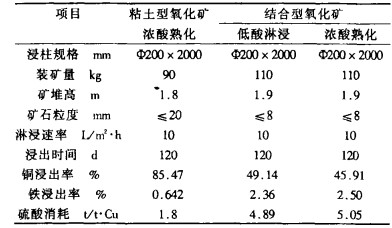 2.3.2 柱浸试验根据搅拌浸出试验结果, 柱浸时, 粘土型氧化矿采用浓酸熟化浸出, 结合型氧化矿采用浓酸熟化及低酸淋浸二种方式。柱浸试验条件和结果见表 8。柱浸试验结果表明: