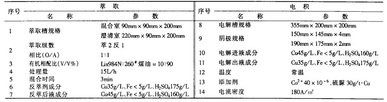 2.4 萃取—电积试验对浸出后的含铜溶液采用了萃取—电积回收方法, 试验主要工艺条件见表 9。