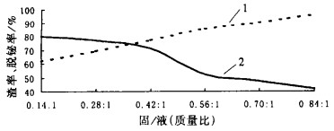 | 图 2 反应固液比与渣率、脱铋率的关系 |