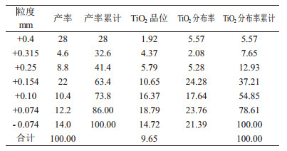 由表 4可知,矿样中+0.4mm以上占28%,TiO2品位1.92%。金属分布率仅5.57%,因此考虑脱除0.4mm以上级别, 采用-0.4mm粒级入选[2-3]。