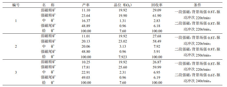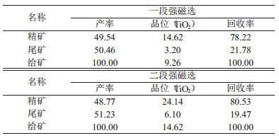 为保证钛收率,磁选机采用大电流高场强运行,场强为0.64~0.9T, 磁选机测试表明,当给矿品位为9.8%TiO2,精矿产率58.42%,品位为14%TiO2,回收率83.45%,尾矿品位为3.9%TiO2。