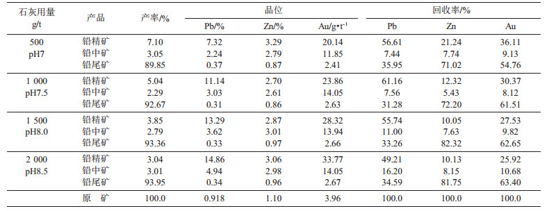 从表 3结果可见,石灰用量低,硫铁矿上浮致使铅粗精矿含铅品位明显下降,由于硫铁矿是载金矿物,金在铅粗精矿中的损失反而上升,给后续铅精选增加负担。石灰用量在1 000~2 000g/t范围内,矿浆pH小于8.5时金的损失相对较小,兼顾考虑铅、锌矿物的回收则应以矿浆pH在7.5~8.0时为宜。