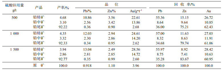 试验结果表明:硫酸锌用量的改变对铅、锌回收影响不大,拟选择硫酸锌用量为1 000g/t。