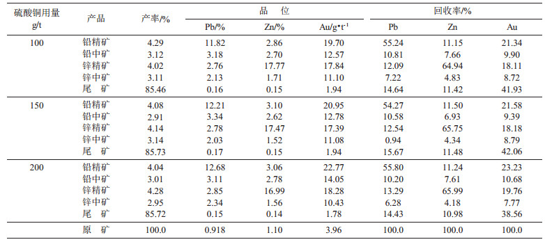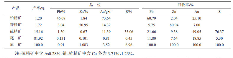 3.5 闭路试验在综合条件开路试验基础上进行闭路试验, 流程中硫粗选作业添加了150g/t用量的硫酸铜,目的是减少Au、Pb、Zn在尾矿中的损失,闭路试验在开路流程基础上,铅、锌、硫各增加一次精选,并采用各中矿循序返回的流程,试验结果见表 7。