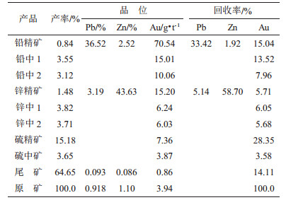 (3)金在铅、锌精矿中的分配率还较高,且铅、锌和硫精矿的质量等级较低,待进一步试验提高。