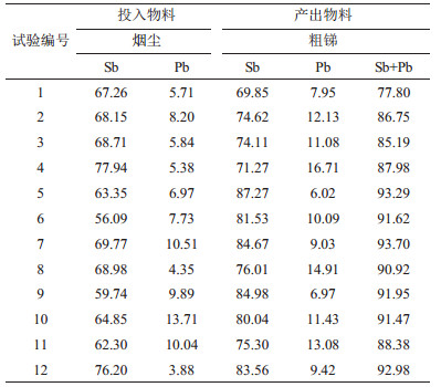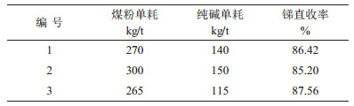 从表 2、表 3可以看出,足够的还原剂有助于铅锑的还原,但随着还原剂量的进一步增加,锑渣粘性增大,金属液与渣层分离效果变差,锑直收率下降。另外,熔剂碱加入量对锑直收率和粗锑质量也有明显的影响,配入适量的碱可得到较高的锑直收率和较好质量的粗锑。但随着碱量的继续加大,渣与金属液难以分辨,增加了放渣难度,同时也造成了碱的不必要浪费。较适宜的配料比为:烟尘:粉煤:纯碱=100:(18~20):(8~10)。