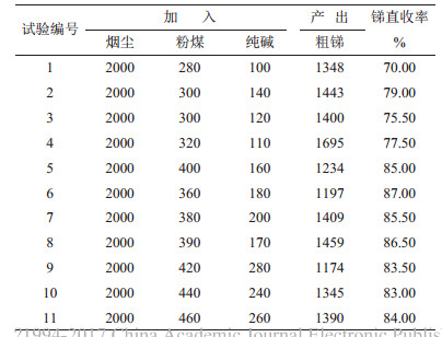 按照不同的配比混合烟尘、粉煤和纯碱,进行了16炉还原熔炼试验,试验结果及产物化学成分含量如表 2、表 3所示。