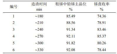 由表 4可知,足够的造渣时间是提高锑直收率的重要条件。但随着造渣时间的延长,金属锑挥发加剧,锑直收率下降。较适宜的造渣时间为240~270min。