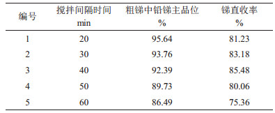 从表 5可以看出,随着搅拌强度的增加,粗锑中铅锑主品位和锑直收率提高。但达到一定程度后,随着搅拌强度的不断加强,锑挥发损失增大,锑直收率开始下降。适宜的搅拌间隔时间为40min。